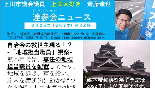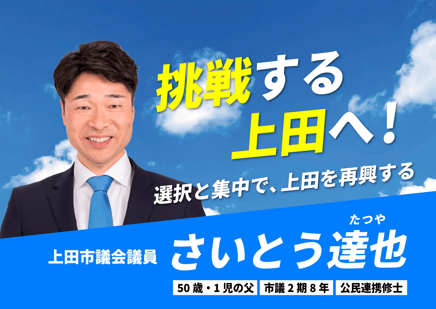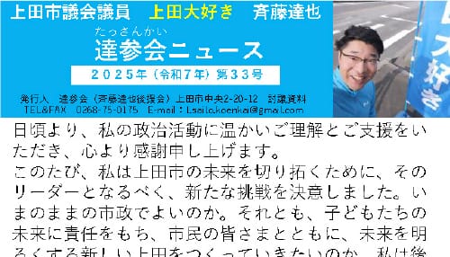 さいとう達也君は、地元・上田市への熱い思いが誰よりも強く、小さな声、声なき声に寄り添える人物です。私が自治会長を務めていた海野町自治会でも、地域住民の声に耳を傾け、誠実に活動してくれていました。市議としての職務に加え、消防団員や自治会衛生部長、商店街理事などの役割を担いながら、大学院を修了されるほどの並々ならぬ熱意と向上心にあふれています。今後ますます期待される政治家だと確信しています。